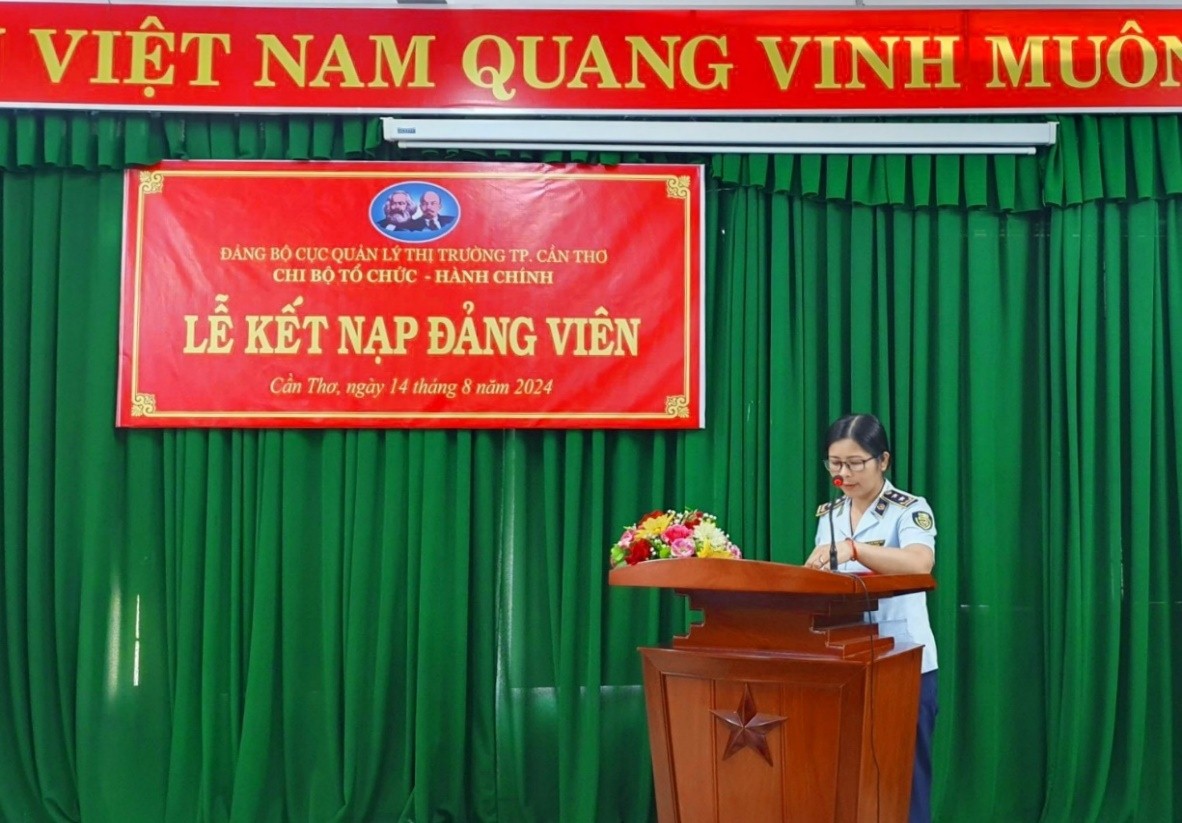 Được sự chấp thuận của Đảng ủy Cục QLTT thành phố Cần Thơ, ngày 14/8/2024, Chi bộ Tổ chức - Hành chính thuộc Đảng bộ Cục QLTT thành phố Cần Thơ đã long trọng tổ chức Lễ kết nạp đảng viên mới cho quần chúng Phạm Hoàng Bảo Yến. Lễ kết nạp diễn ra theo đúng trình tự, thủ tục của Điều lệ Đảng. Đứng dưới cờ Tổ quốc, cờ Đảng và chân dung Chủ tịch Hồ Chí Minh, đồng chí Phạm Hoàng Bảo Yến đã tuyên thệ nguyện trung thành với mục tiêu, lý tưởng của Đảng, hứa sẽ tiếp tục phấn đấu, không ngừng học hỏi, rèn luyện nâng cao trình độ lý luận và chuyên môn nghiệp vụ để hoàn thành nhiệm vụ của người đảng viên Đảng Cộng sản Việt Nam.